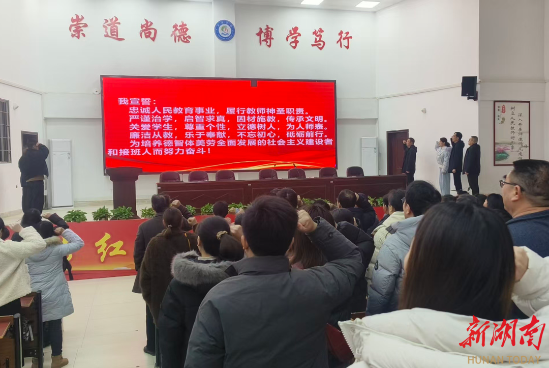 现场,全体教师举起右拳,进行师德师风庄严宣誓,进一步坚定立德树人、潜心育人的职业初心。