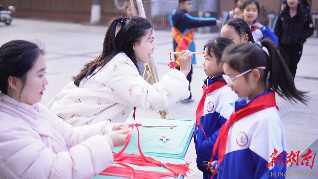 朱砂启智,红绸纳福。在“躲春”环节,老师们手持朱砂笔为孩子们轻点额头,并系上红绸。“这是希望我们聪明,也是提醒我们要像千里马一样跑得快!”一名二年级学生兴奋地说道。小小的仪式感,在孩子们心中种下了“千里之行,始于足下”的种子。