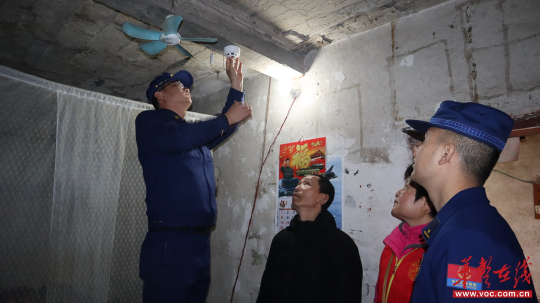 消防员为困难群众安装烟感报警器。通讯员供图