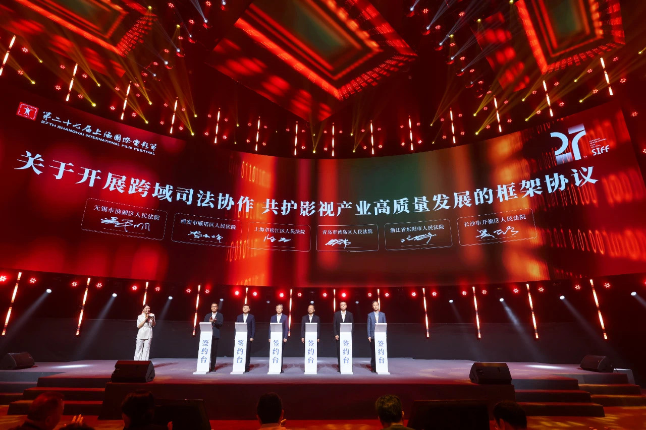 东阳法院与上海松江、青岛黄岛、西安雁塔、长沙开福、无锡滨湖五地法院共同签署《关于开展跨域司法协作 共护影视产业高质量发展的框架协议》。受访者供图