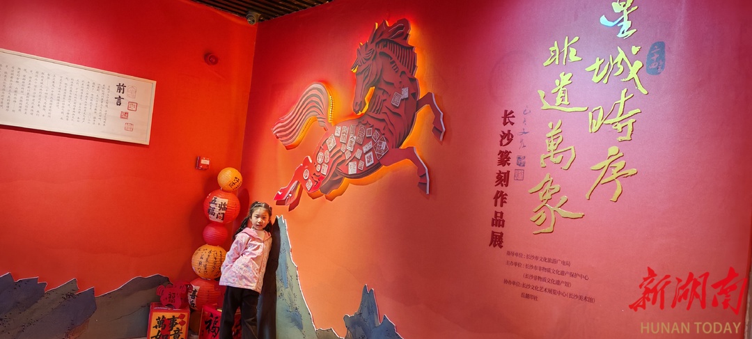 2月3日,星期二,爸爸妈妈带我去了长沙非遗文化馆,我看到好多神奇的东西,心里特别好奇。一进门,就被一面红色的墙吸引住了。墙上有一匹用材料纸做的大红马,它身上贴满各种各样的印章,看起来威风极了。旁边的牌子上写着“星城时序,非遗万象”,还有“长沙篆刻作品展”几个大字。我和这匹大红码合了影,希望新的一年能像它一样,一马当先,勇往直前。