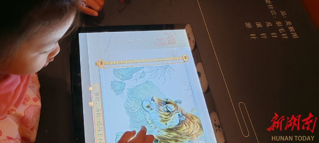 接着,我们去看了湘绣。我在一个大屏幕墙看到了栩栩如生的大老虎,它的毛一根一根的,好像真的一样。讲解员阿姨说这是用掺针和齐针绣出来的,还告诉我湘绣是我们湖南的宝贝,已经有很久很久的历史了。我用手指轻轻点了点屏幕,老虎的眼睛好像还会动呢,真神奇! 今天的非遗之旅,让我知道了我们长沙有这么多厉害的传统手艺。我觉得这些手艺人真了不起,我要好好学习,把我们的传统文化记心里。