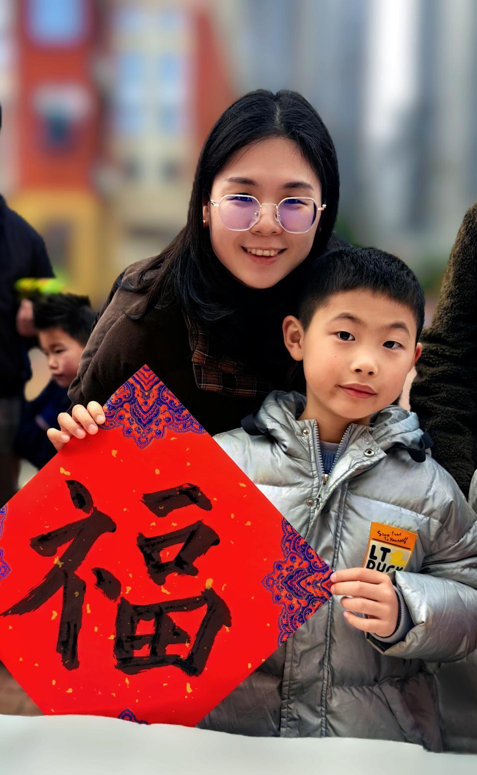 “墨香传福”区域,家长们、孩子们执笔蘸墨、凝神运笔,写下或苍劲有力或稚拙童趣的“福”字。一个个“福”字,满载新学期美好期许,更传递着“认真做事、沉稳做人”的德育理念。