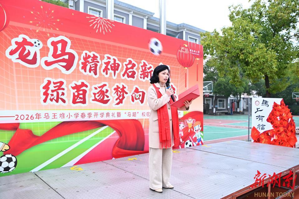 科教新报·新湖南客户端讯(通讯员 唐婷 曾意文)3月5日上午,长沙市芙蓉区马王堆小学全体师生、家长代表齐聚校园足球场,举行2026年春季开学典礼暨“马超”校园足球文化节开幕式。本次活动以“龙马精神启新程 绿茵逐梦向未来”为主题,将千年马王堆文脉、足球竞技精神与学校“知古今、明理德、思进取”校训深度融合,以体育强体魄、以运动润童心,为新学期注入昂扬活力与蓬勃朝气。