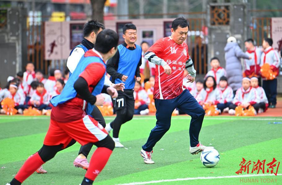 随后,足球友谊赛正式开赛。“爸爸足球队”与湘超球员同场竞技,攻防交错、配合默契,每一次精准传球、每一次奋力射门,都引来全场欢呼呐喊,将“快乐足球、阳光成长”的理念深深扎根在每一名孩子心中,让体育锻炼成为校园生活的常态,让健康体魄成为成长路上的底气。