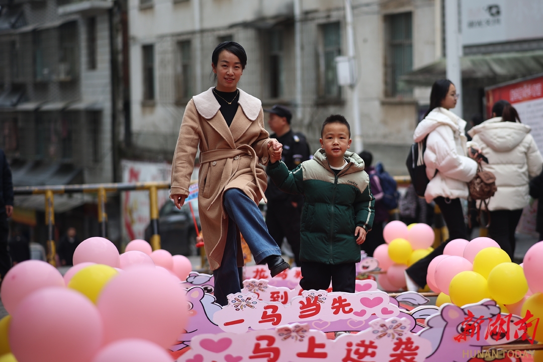 图为学生和家长跨过有“马”字寓意的打卡牌。