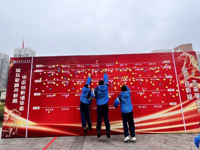 长沙市天华中学的开学报到日同样洋溢着蓬勃朝气,以独具新意的形式为新学期绘就温暖序章。校园里,师生们齐聚 “摸高纳福” 墙前,大家竞相起跳,将写满美好心愿的新年卡片奋力贴向墙面高处,每一次奋力跃起,都是对新学期的热切期盼,更是对未来的勇敢奔赴。全校师生以 “星火相传,微光成炬” 为信念,秉持昂扬向上的精神姿态,立志争做新时代追 “锋” 人,让青春在爱心接力与无私奉献中熠熠生辉。墙前跳跃的身影、高悬的心愿卡片,汇聚成春日里最动人的画面,也为新学期的成长之路写下了充满希望的开篇。