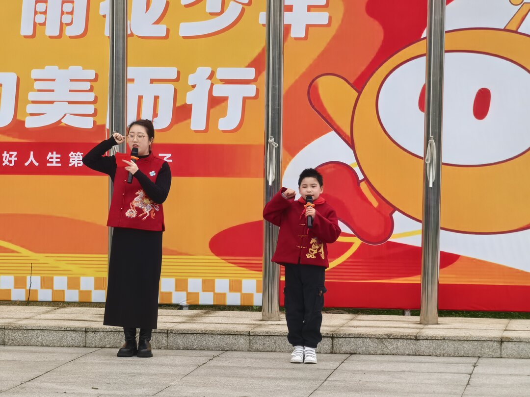 大队部邓老师总结寒假实践活动,为“小小发现家”颁奖,他们用画笔、镜头记录身边美好,践行孝心与奉献之美,让师生懂得美在日常;三年级8位“橙星向美小标兵”,从自身、亲人、伙伴、社会维度分享寒假“最美瞬间”,传递人间温情之美;四年级慷慨朗诵《满江红》,铿锵词句尽显少年担当,让全场感受震撼人心的家国情怀之美。