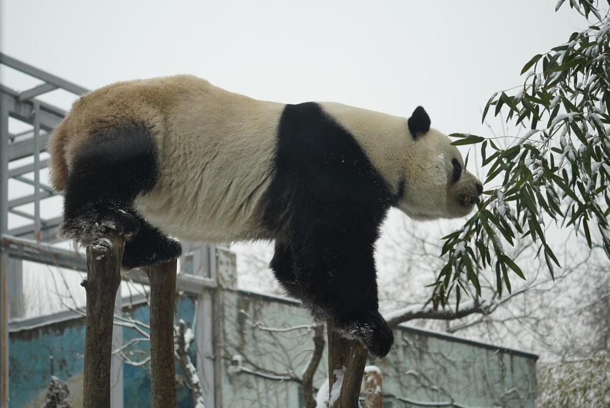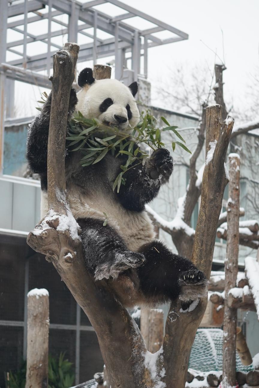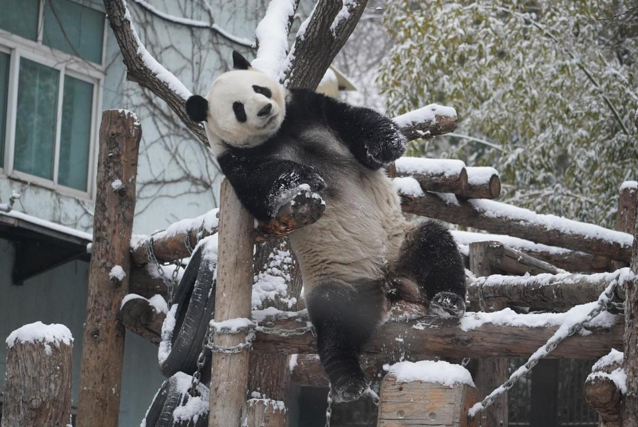 3月5日,雪后的北京动物园银装素裹。大熊猫萌兰看到白雪也兴奋不已,在雪地里登高爬低,尽情打滚玩耍,化身“糖霜小熊”,模样憨态可掬,萌化市民游客。