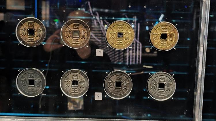 “永昌大元帅”金印、“西王赏功”金币等核心文物吸引了众多目光。尤其是一组从江口出水的大西政权册封嫔妃金册,铭文清晰可辨,为研究大西政权的典章制度提供了有力佐证。展柜一旁,百子铳、铅弹、铁蒺藜静静陈列,无声诉说着1646年那场惊心动魄的江口之战。