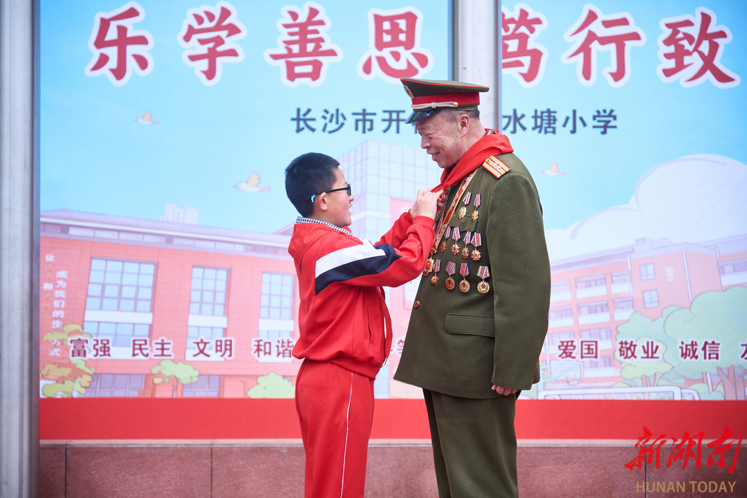 少先队员代表怀着崇敬之心为罗爷爷佩戴了红领巾。在互动提问环节中,孩子们带着对英雄的好奇与敬仰举手提问,罗爷爷则一个个耐心解答。在亲切的互动中,孩子们对烽火岁月、保家卫国等词汇有了更真切的感知。