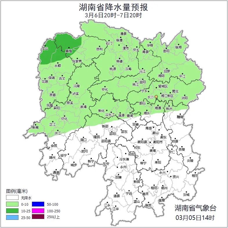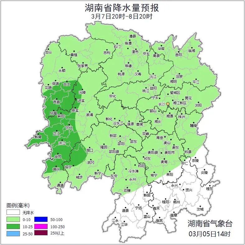 7日晚上至8日白天,阴天间多云,大部分地区有小雨,其中湘西局地中雨;北风2~3级;最低气温7~10℃;最高气温湘中以北12~16℃,其他地区17~21℃。