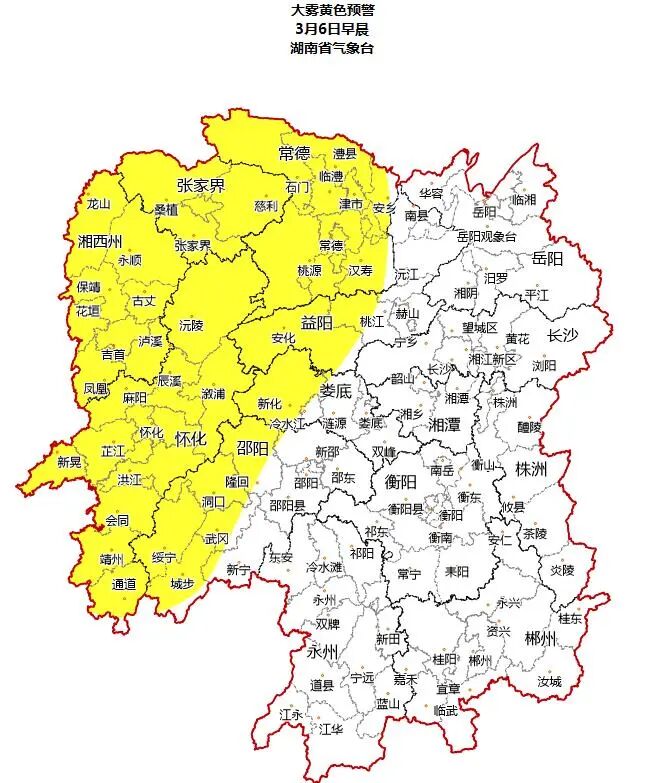 湖南省气象台3月5日16时发布大雾黄色预警: