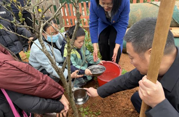 最受孩子们期待的植树环节如约而至。全体人员列队前往植树区,孩子们与区领导、老师、家长、志愿者们结对协作,共同种下希望之树。萌娃们踮着脚尖,学着大人的样子培土、浇水,小手扶苗,大手扶正,一棵棵小树苗在春日里扎根,这是孩子们与春天的约定,更是对新学期的美好憧憬。