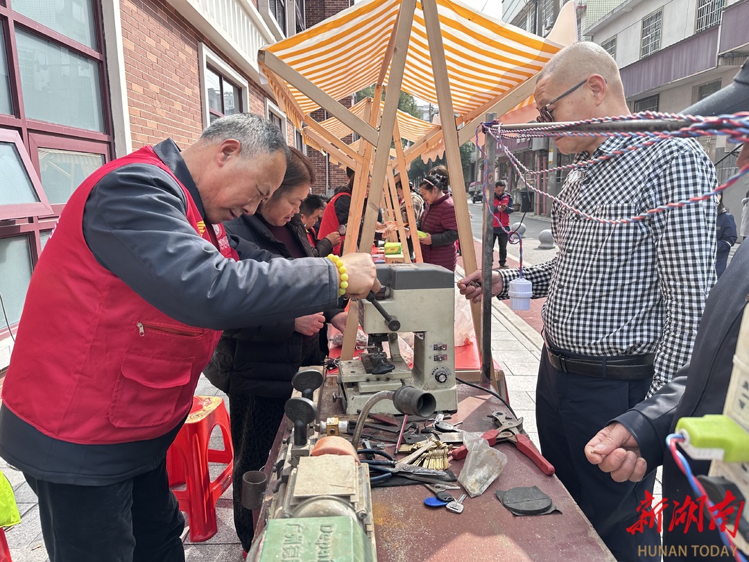 市集现场,便民服务摊位一字排开,配钥匙、修鞋、小家电维修、缝纫、磨刀、理发、手机贴膜、政策咨询等服务项目琳琅满目,每一个摊位前都站满了居民,“生意”十分火爆。提供便民服务的志愿者们马不停蹄地处理着“订单”,一个个忙得满头大汗。