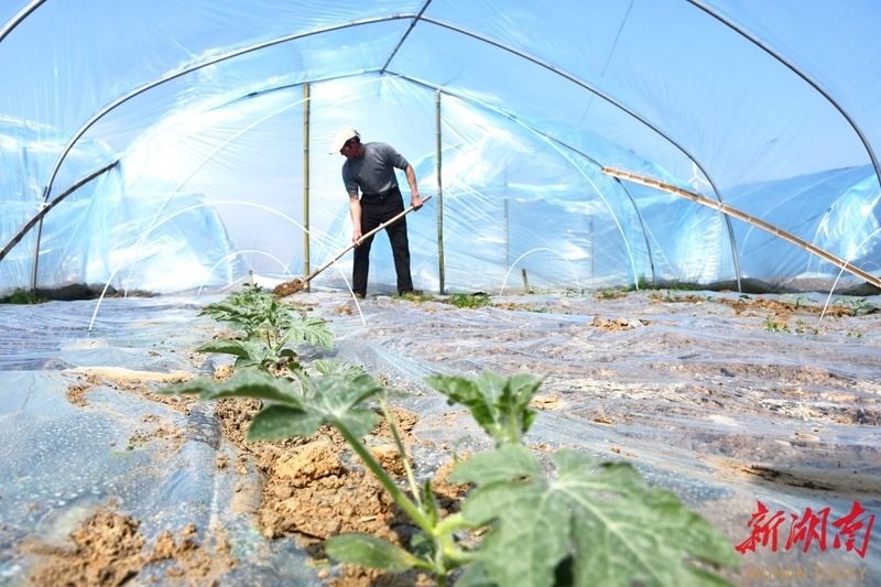 3月5日,江永县潇浦镇,农民在大棚里管护西瓜苗。惊蛰节气,各地农民抢抓农时,田间地头一派忙碌景象。田如瑞 摄(湖南图片库)