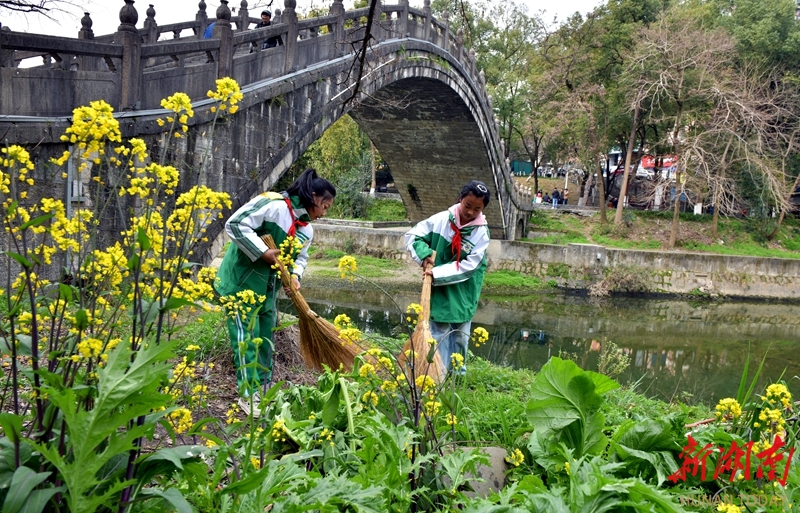 3月5日,吉首市峒河街道向阳社区,光明小学学生在清扫、捡拾垃圾。当天是学雷锋纪念日,各地开展形式多样的活动,传承雷锋精神,弘扬时代新风。姚方 杨燕萍 摄影报道(湖南图片库)