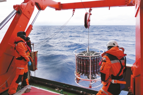 北京时间2026年1月24日,“雪龙”号大洋队队员丁伟康(左)和宋熙存在舯部甲板开展中国第42次南极考察阿蒙森海区域首次温盐深剖面观测和海水样品采集作业。新华社记者 顾天成 摄