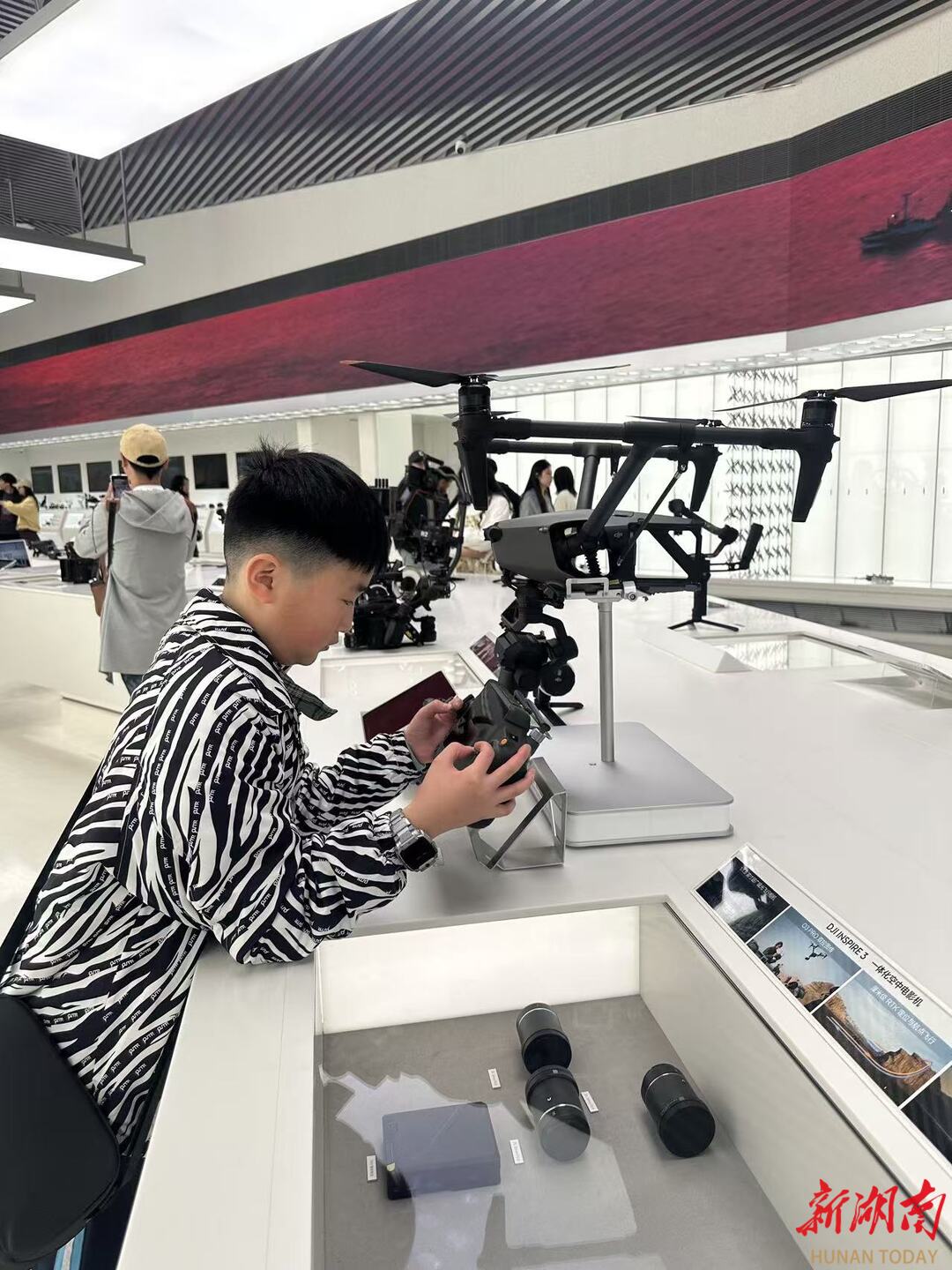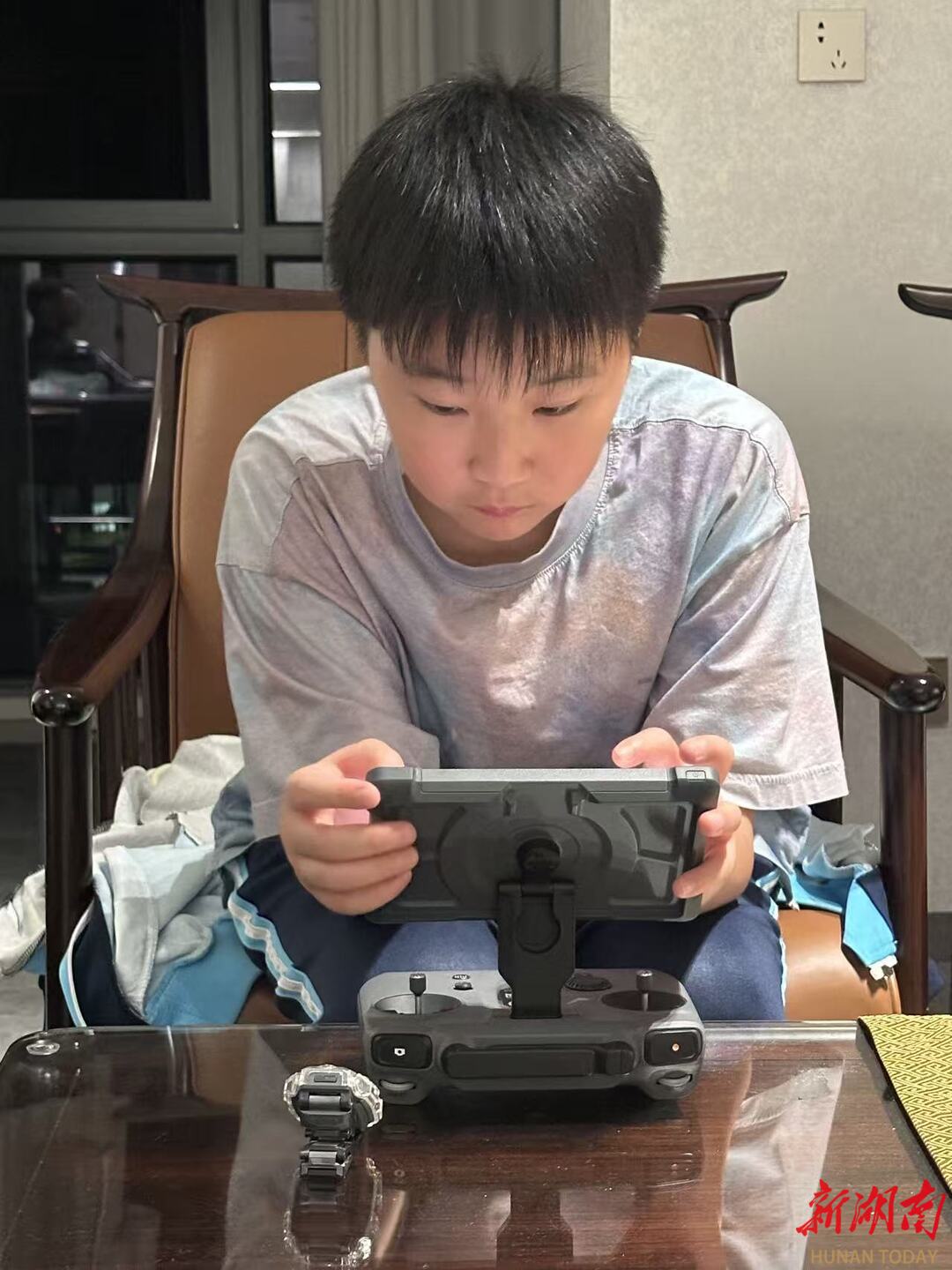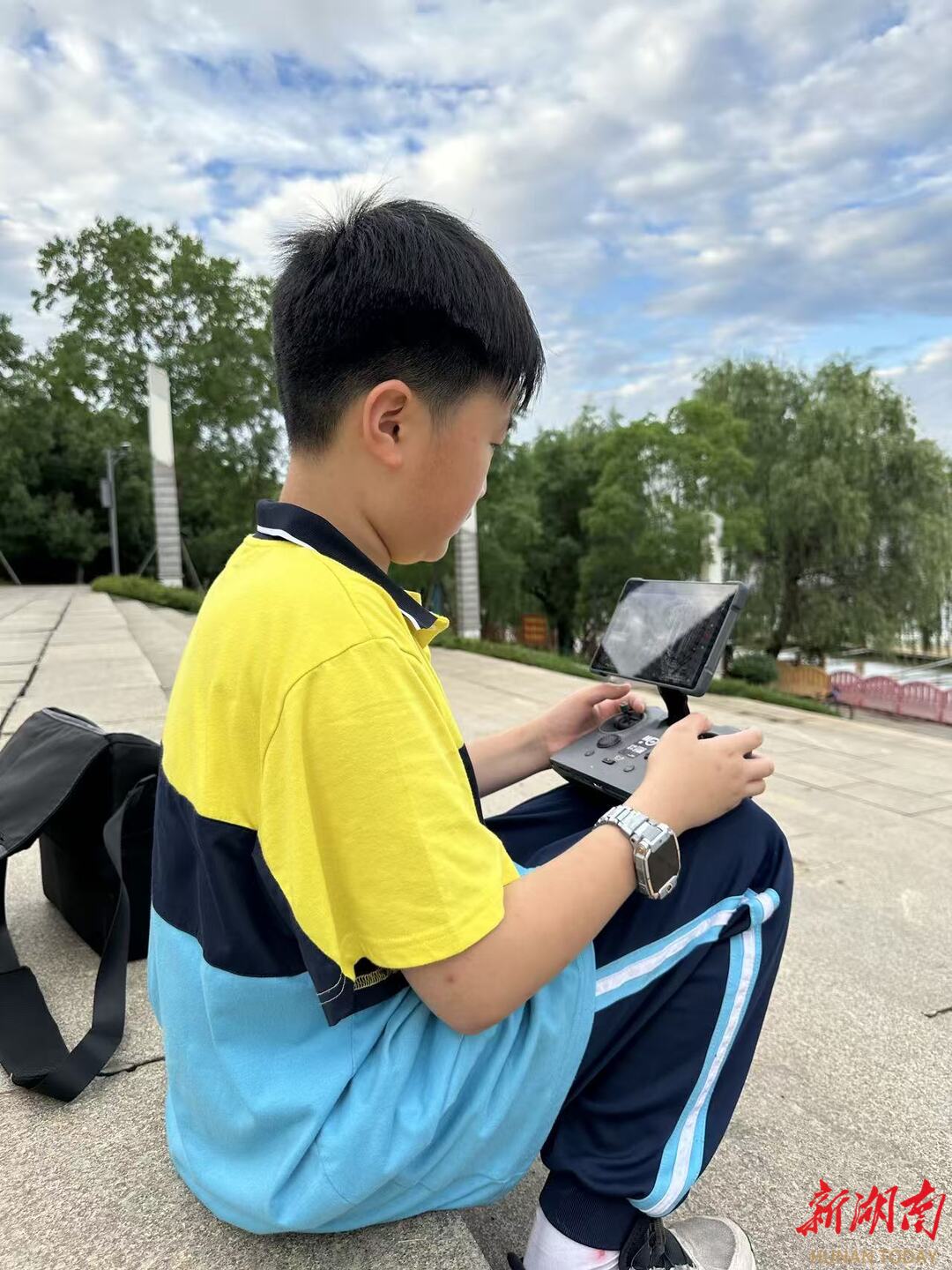为了赶时间,他的爸妈经常骑着小电驴驮着他无数次往返湘江边试飞无人机。有一次下雨天白天没拍好影像,他妈妈拖着疲惫的身子陪他拍摄到凌晨二点。为了实现心中的梦想,他的母亲多次陪他去深圳大疆总部天空之城拍摄,妈妈总是鼓励他:“走自己的路,在天空翱翔”。