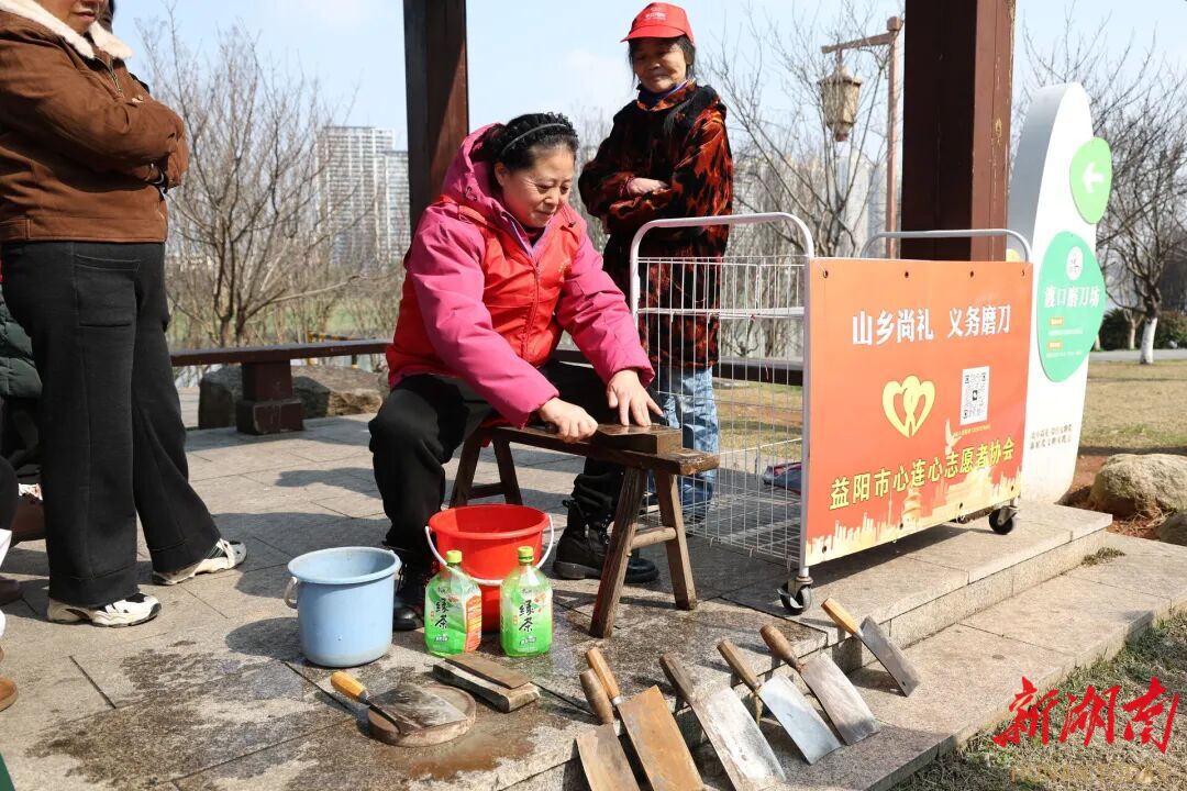 百米外的渡口磨刀坊,“嚯嚯”的磨刀声此起彼伏。志愿者龚年珍弯腰蘸水、推拉打磨,专注地为居民磨刀。居民们在一旁等候,脸上满是笑意。