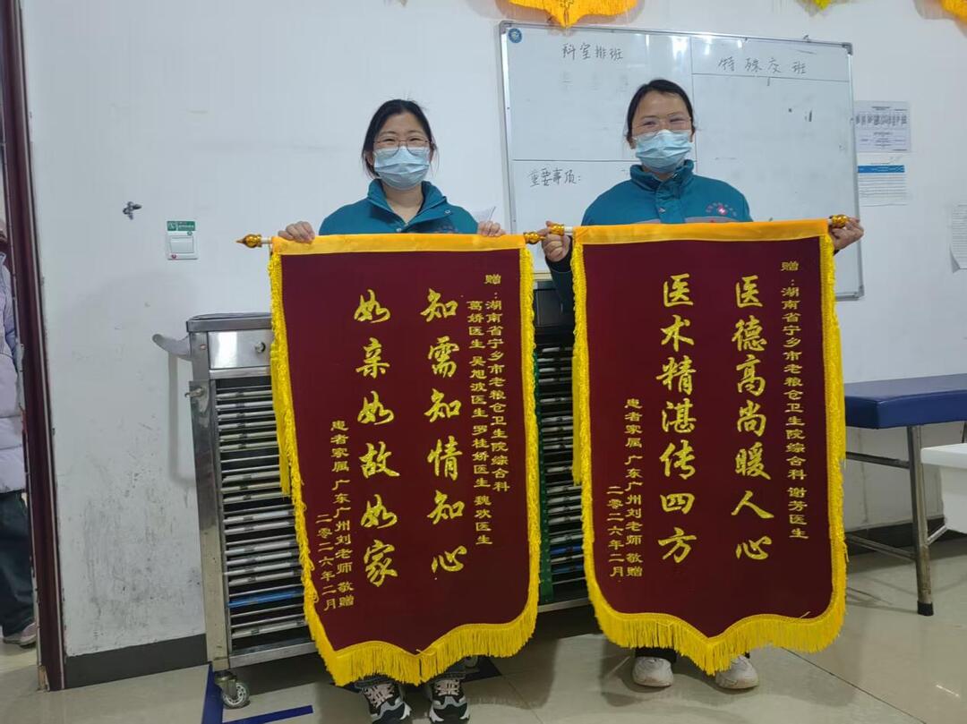 新湖南客户端3月6日讯(通讯员 隆李芊)近日,宁乡市老粮仓卫生院收到两份从广州远道寄来的锦旗,这是九旬慢阻肺患者刘老伯的家属,为感谢科室救治老人特意定制的感恩之礼,字里行间满是千里之外家属对卫生院诊疗水平与服务态度的高度肯定和由衷满意。一面锦旗赠予谢芳医生,题词“医术精湛传四方 医德高尚暖人心”;一面赠予科室全体医护,题写“知需知情知心 如亲如故如家”,寥寥数语,承载着家属沉甸甸的感激与认可。