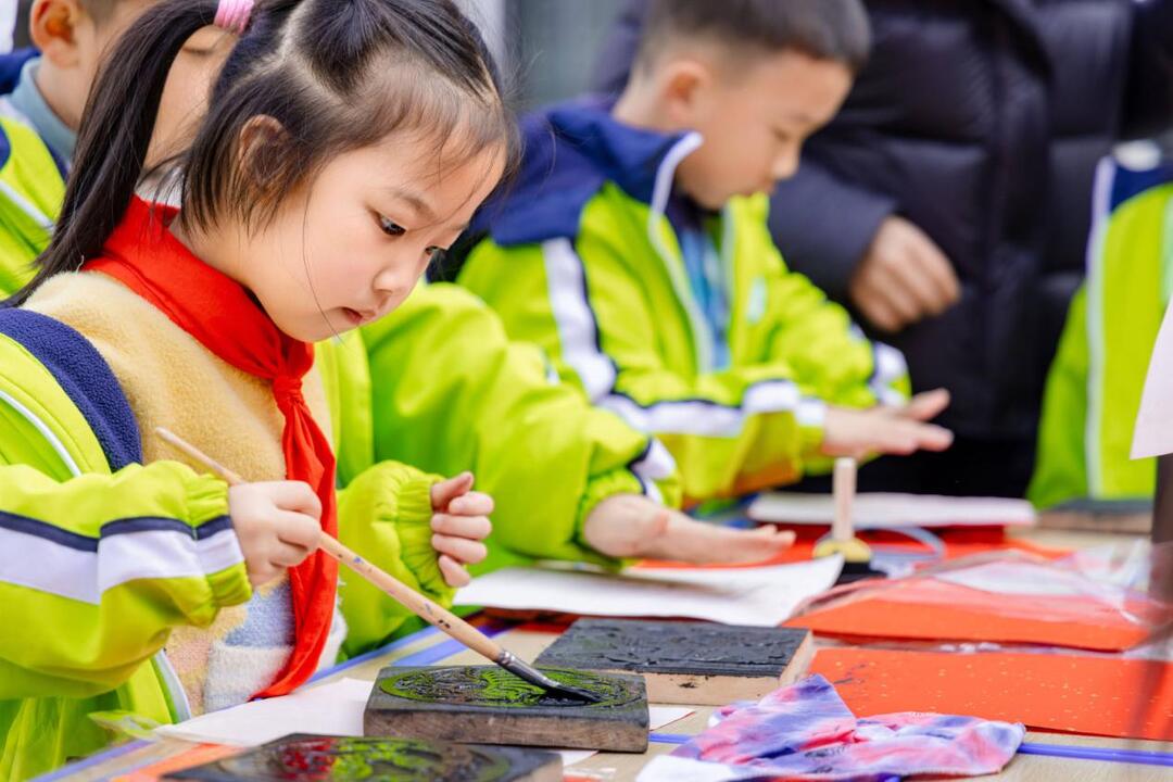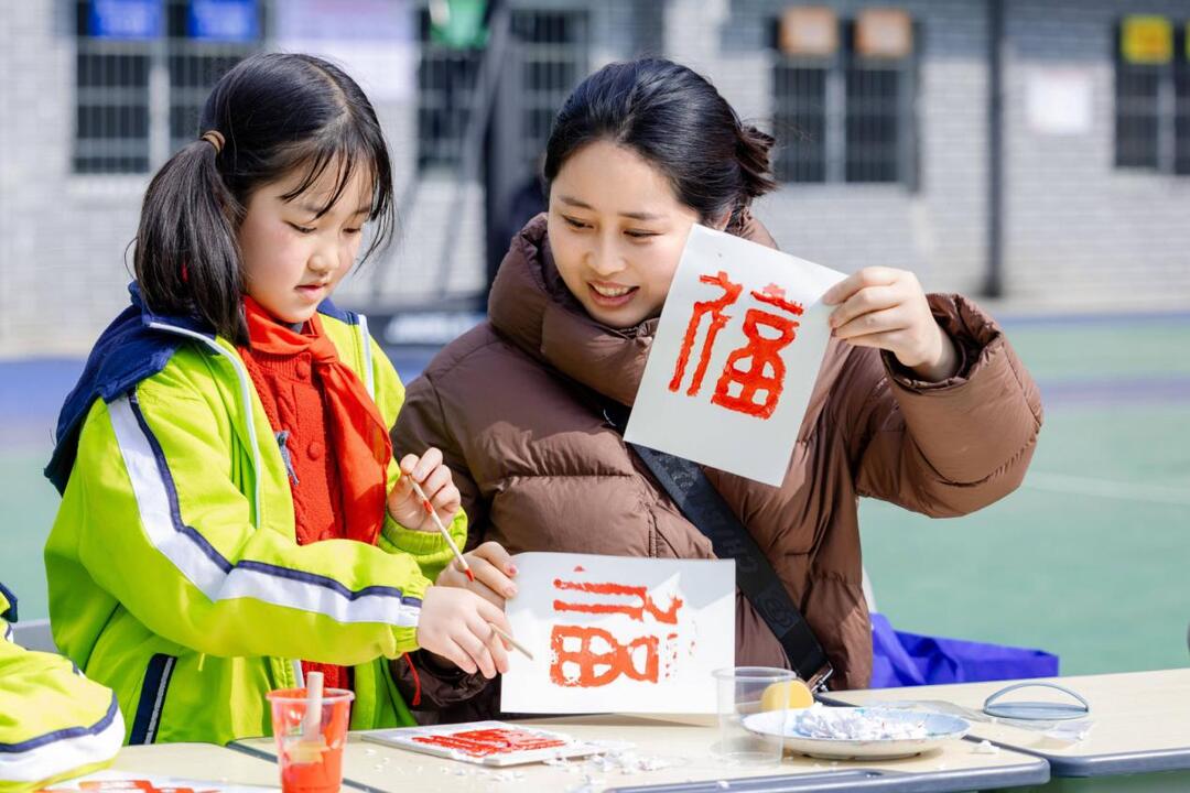 为了让更多孩子感受非遗魅力,学校还贴心地在操场周边设置了剪纸、拓印、写福字三个开放式体验点,让下课路过的孩子们也能随时驻足参与,真正实现了“非遗润童心,文化满校园”。