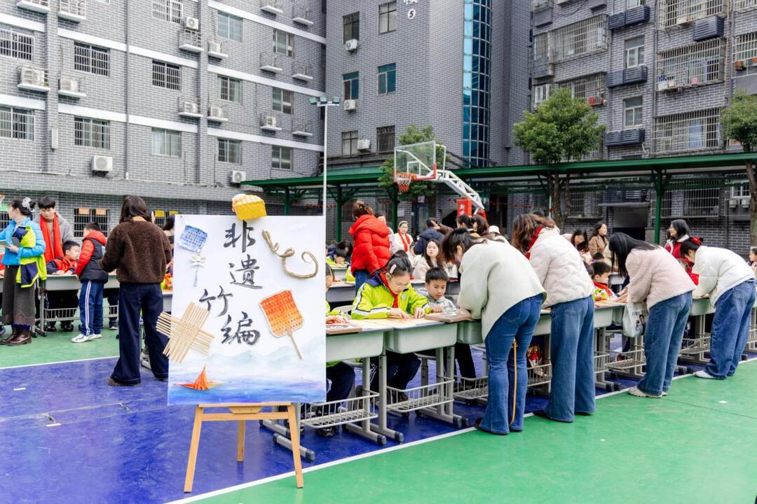 在 “字印岳阳楼·文脉润童心” 活字印刷区,家长握着孩子的小手,共同排版刷墨,阳光映照着宣纸上清晰的墨迹,将《岳阳楼记》的经典名句印制在纸上,墨香中传承的是千年的文脉;“版印新春·画纳百福” 年画区,亲子合力印制马年吉祥图案,一版一刻尽显匠心;“福拓新岁·吉满南湖” 拓印区里,“福”字在手中诞生,家长和孩子一起吹干墨迹,寓意福气扎根校园。最受欢迎的当属 “剪韵迎春·纸载吉祥” 剪纸区,巧手翻飞间,生肖马与吉祥花鸟跃然纸上,阳光透过红纸映出温暖的光晕;而在 “竹编福马·节节高升” 区,一根根竹条在亲子协作下编成马年吊饰,象征气节与远志。此外,“锡光映福·匠心留痕” 的锡纸画在阳光下熠熠生辉,“染韵东方·彩绘和美” 的扎染方巾随风轻扬,色彩斑斓如春日画卷,“伞绘南湖·春润桃李” 的油纸伞下,孩子们绘出心中最美的岳阳楼与春天,撑开的伞面如花朵般绽放在操场之上。