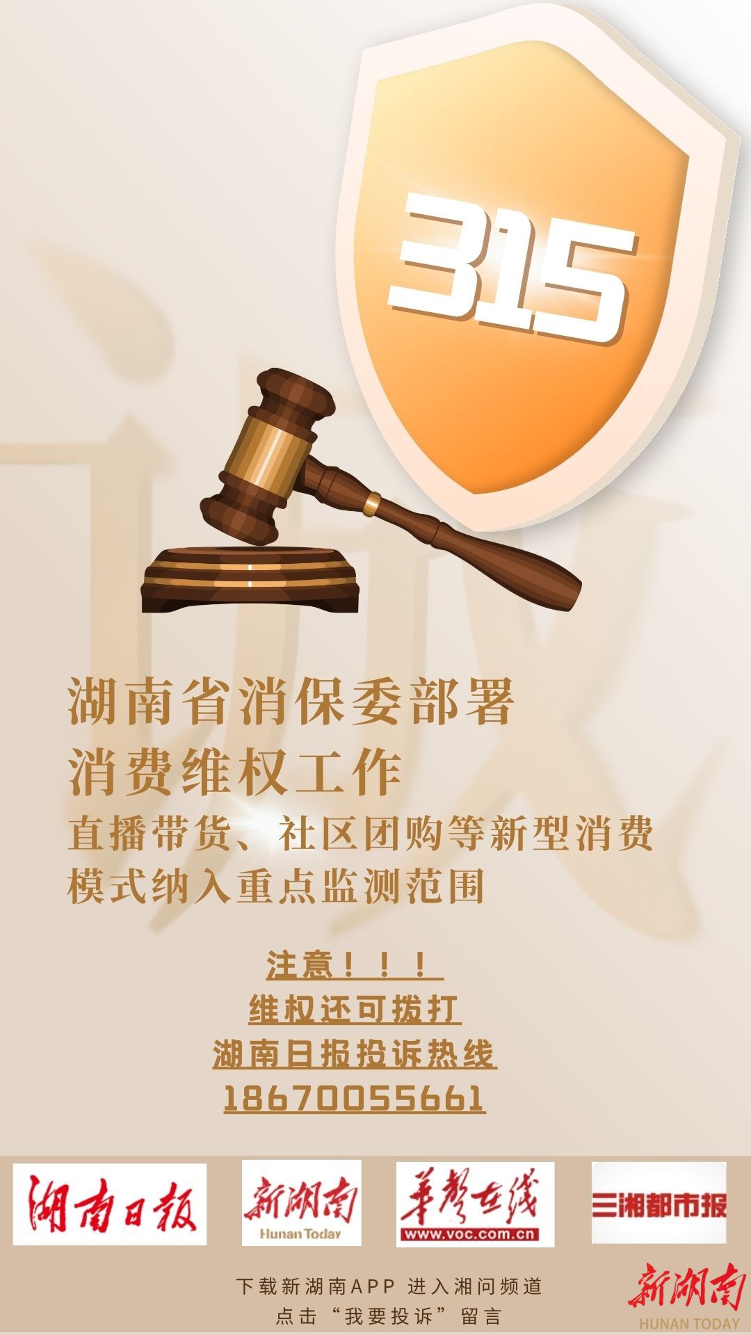 湖南日报·新湖南客户端3月5日讯(全媒体记者 李成辉)湖南省消保委日前下发通知,对全省“3・15”国际消费者权益日期间消费维权重点工作作出全面部署。今年湖南将紧扣“优化消费环境 提升消费品质”主题,以风险防控、多元共治、宣传引导、应急值守为抓手,全力守护消费者合法权益。
