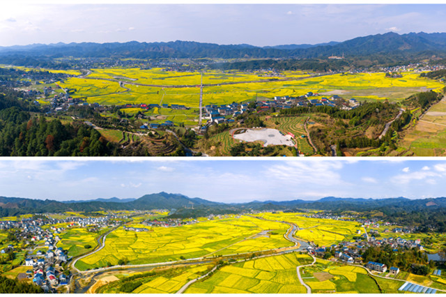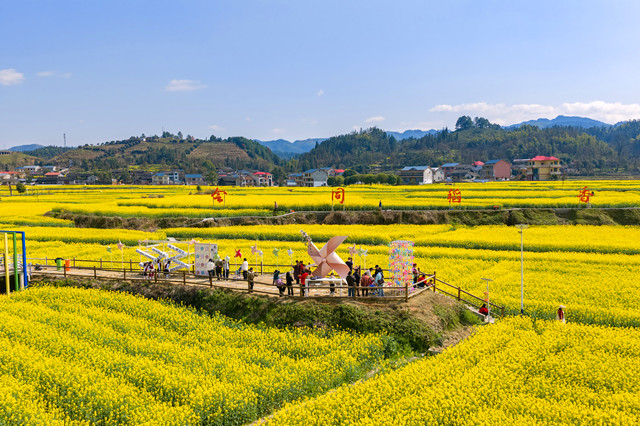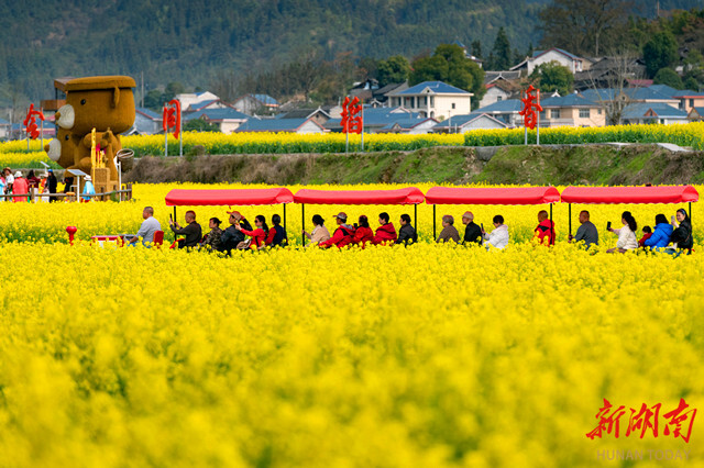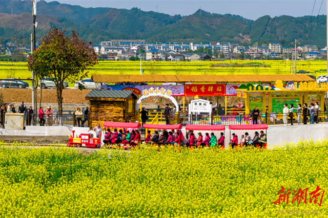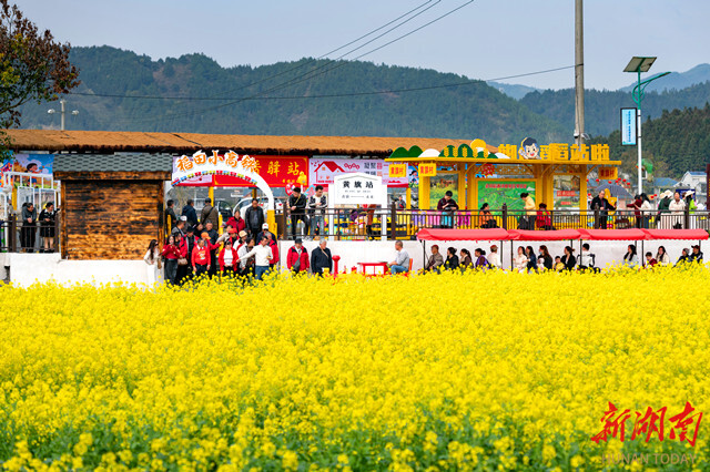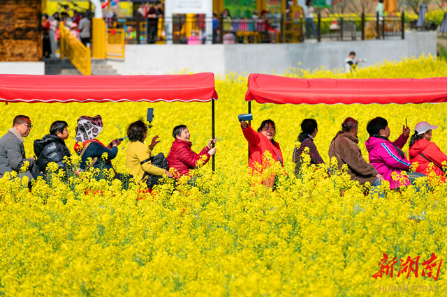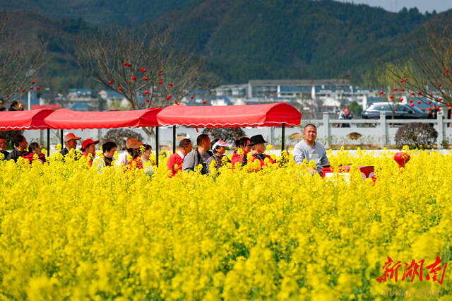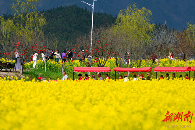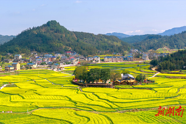 3月5日,春风和煦,晴空万里。会同县堡子镇稻香诗田景区春意盎然、人气火爆。连片油菜花竞相绽放,汇成金色海洋,花香四溢、美不胜收。(通讯员 张镭 摄)
