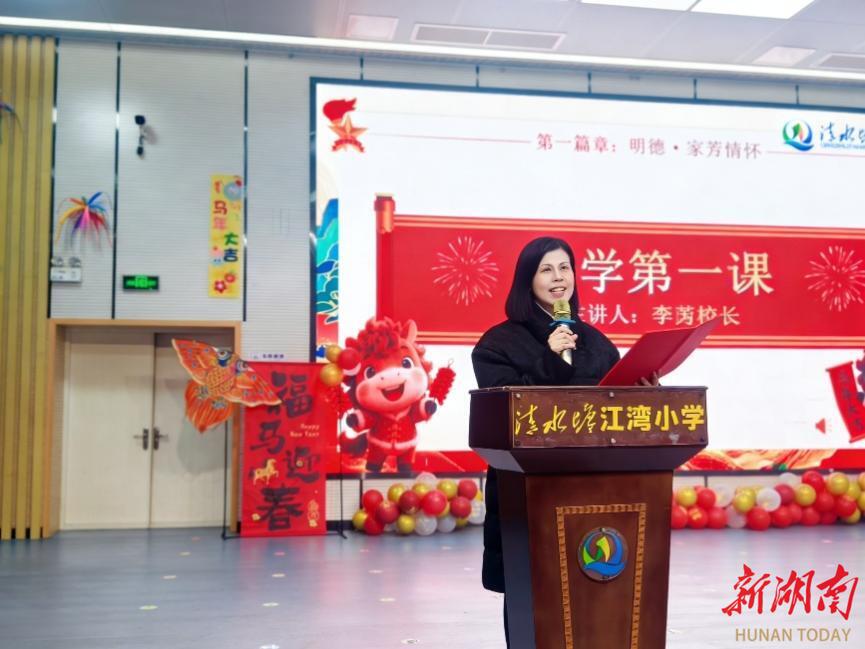 李芳校长以《在春天的起点,走向2030》为题讲授开学第一课,抛出“心里有爱、言行有礼、做事有恒”的启航三问。在接受湖南日报全媒小记者欧阳佳一、唐雨馨采访时,她表示:“要把学校办得更有特色,让孩子们在身体、心理方面都成为健康的好少年;让江湾少年都能成为‘心中有爱’,‘温暖他人’的人。”