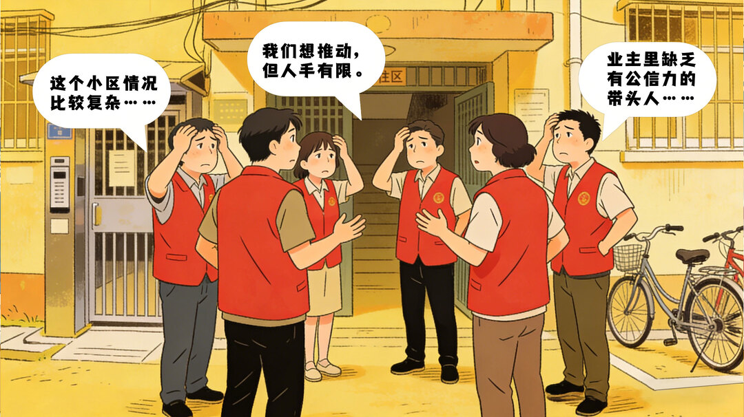 街道工作人员:“这个小区情况复杂,业主之间也不团结,缺乏有公信力的带头人,我们想推动,但人手有限,没有具体的抓手。”