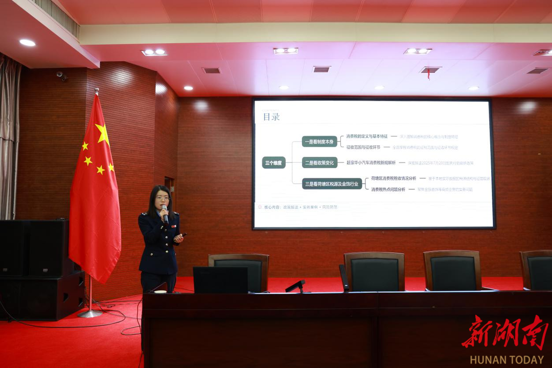 课堂上,文晴以消费税为课题,系统梳理了消费税的定义、税制要素等基础知识,深入解读了超豪华小轿车消费税新规,并结合荷塘实际,分析税收情况与常见问题,展现了扎实的业务功底。