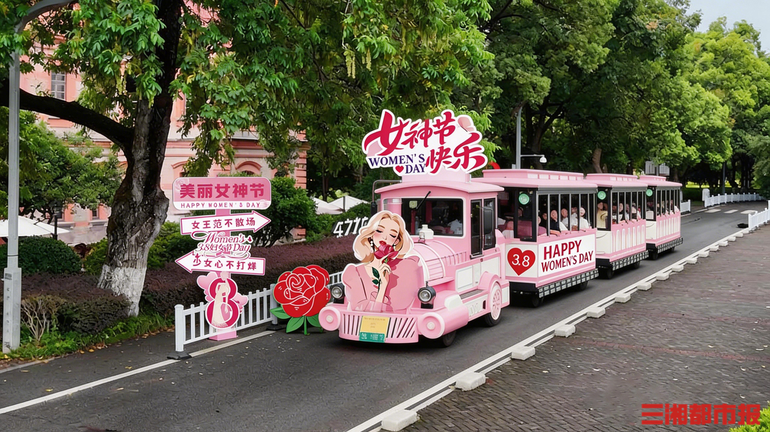 活动当天,将推出节日限定的“粉色小火车主题专列”。观光小火车将以粉色为主色调进行装饰,并固定摆放在景区核心区域,打造集拍照与互动于一体的主题打卡点。现场将搭配女神节主题立牌、粉色布幔以及多款手持拍照KT板等元素,营造温馨浪漫的节日氛围。届时,不少游客可以在粉色小火车前拍照留念,在湘江之畔记录春日里的美好瞬间。