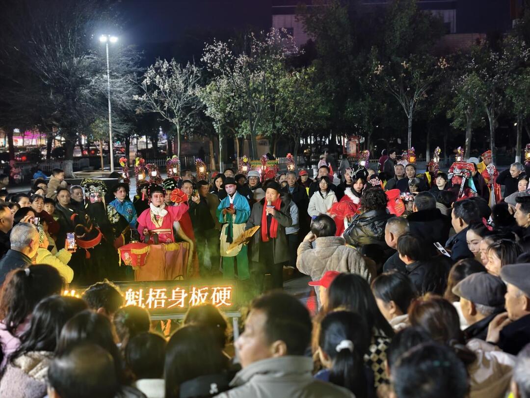 巡演现场,非遗民俗的独特魅力尽显无遗。铿锵锣鼓搭配悠扬唢呐,奏响新春序曲;演员身着特色传统服饰,手持排灯、马灯踏乐而行,灵活变幻出“大开门”“半边月”“8字阵”“九曲黄河”等经典阵势,灯影流转宛若星河。“车子姑娘”舞绢提灯吟唱乡土小调,“三化子”插科打诨逗乐观众,唐僧师徒、蚌壳精、鲤鱼精等扎故事形象灵动穿梭;《四门求财》《十月子飘》等地花鼓、《采茶舞曲》《放风筝》等传统舞蹈轮番上演,即兴说赞、邵东方言顺口溜妙语连珠,引得观众掌声、笑声不断。