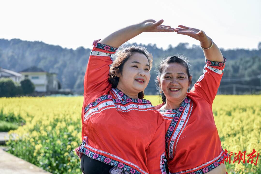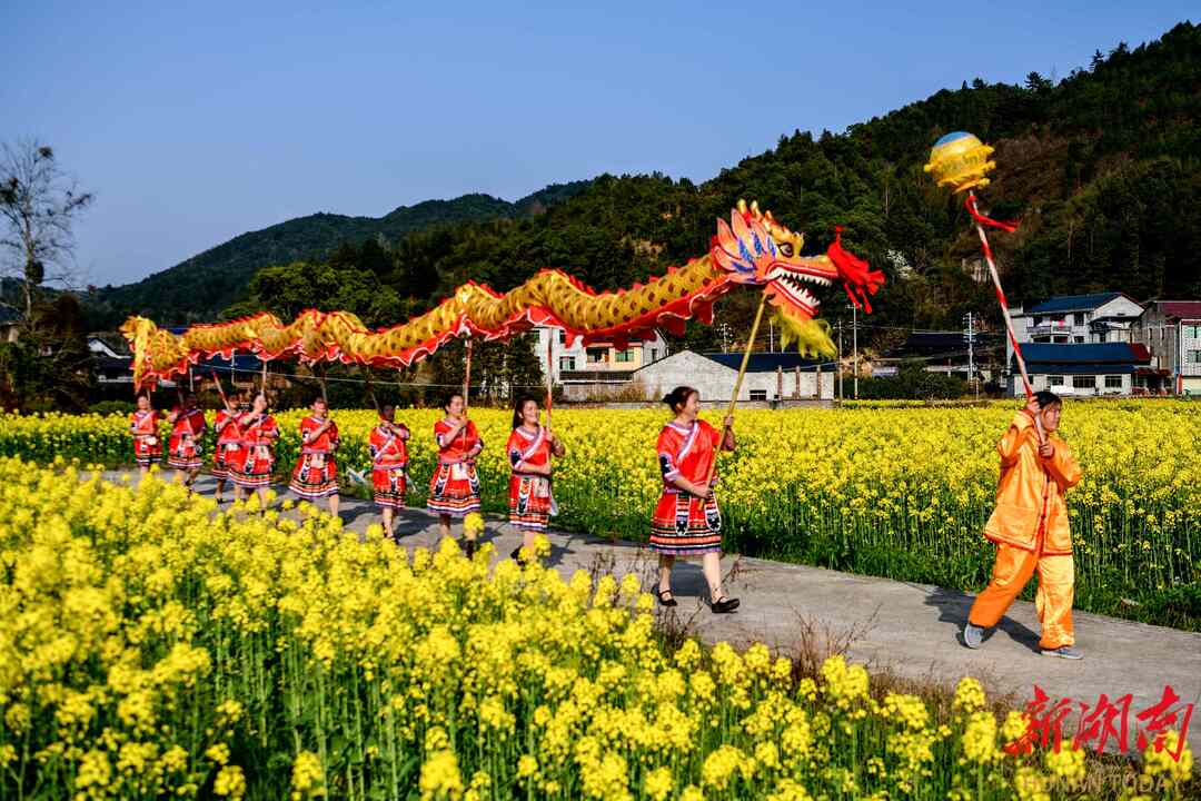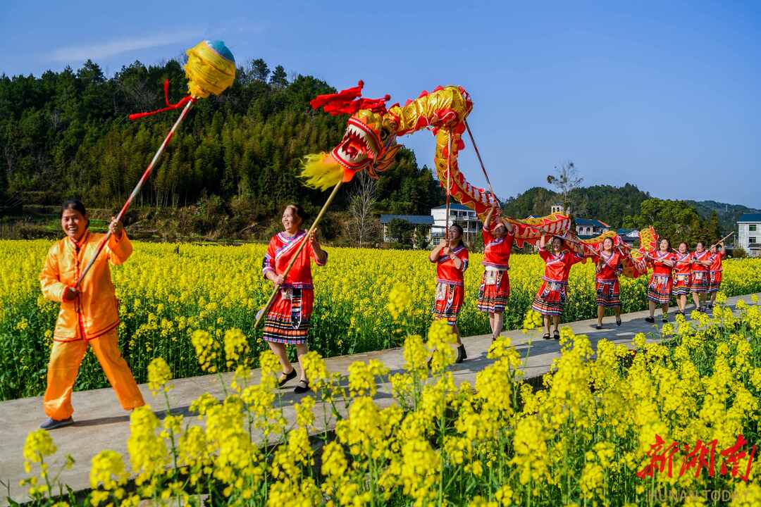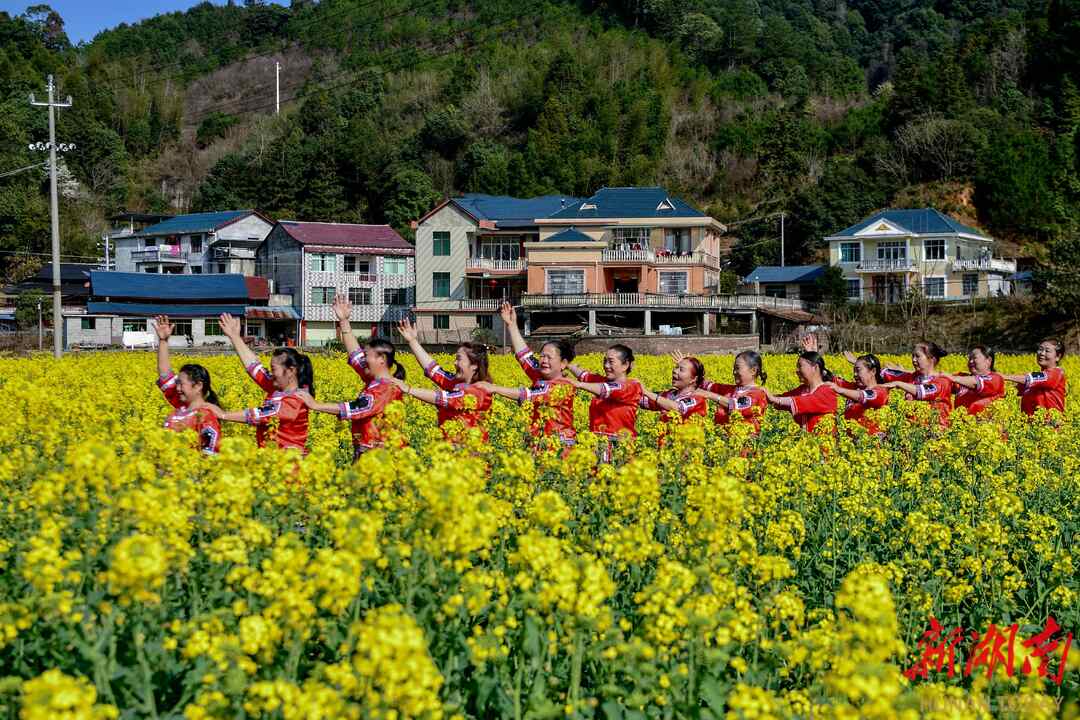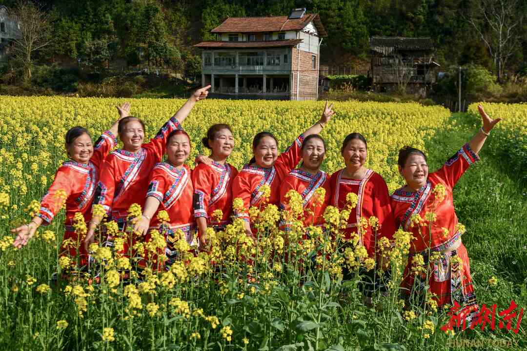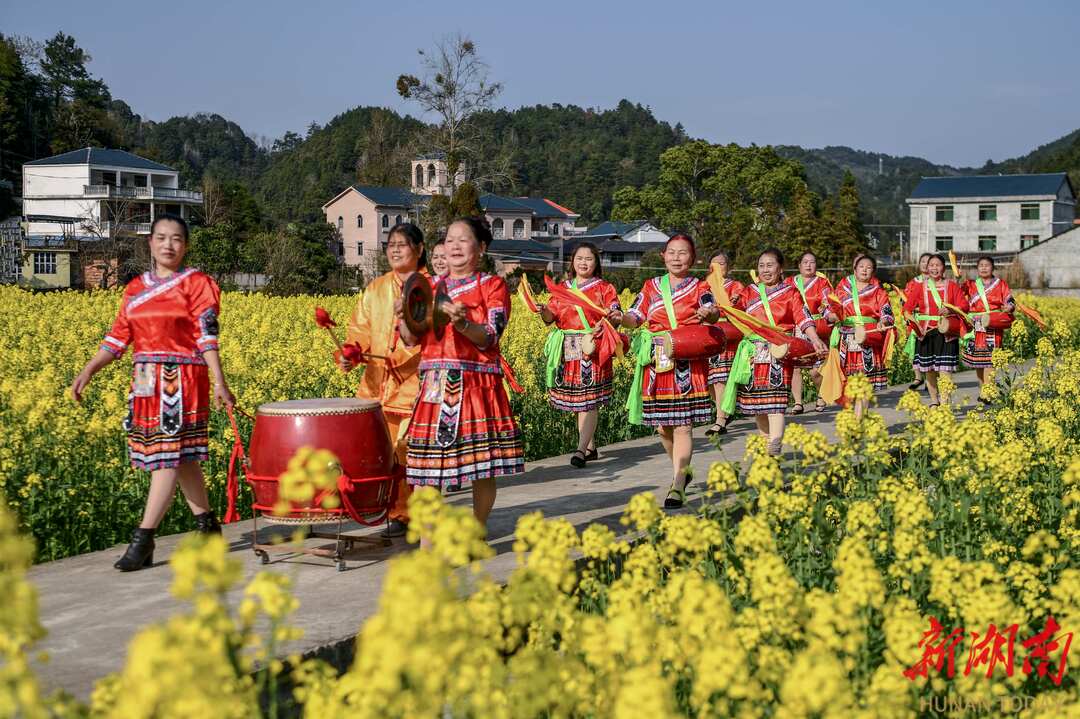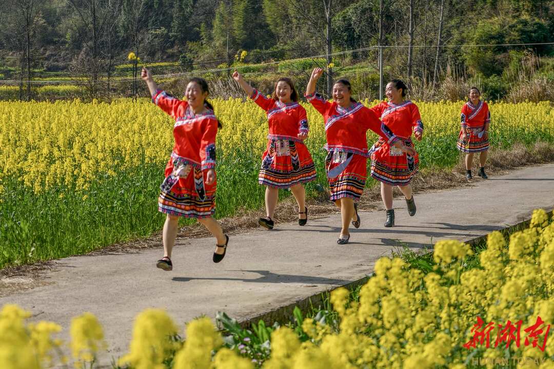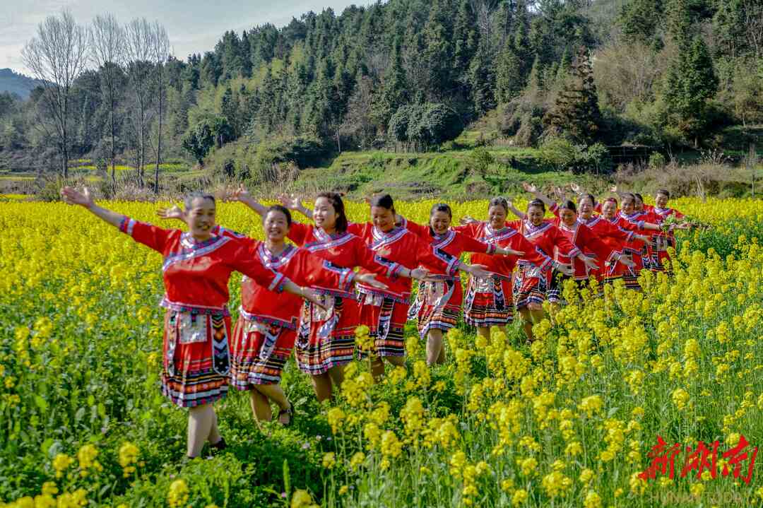 3月5日,阳光明媚,春暖花开。通道侗族自治县溪口镇杉木桥村场上组的妇女姐妹们,身着节日盛装,喜气洋洋奔走在希望的田野上。她们时而唱歌跳舞,时而敲锣打鼓,时而龙舞花间,时而与花合影。当夕阳余晖时,欢聚一堂,共进晚餐。举杯同庆,欢度三八妇女节。