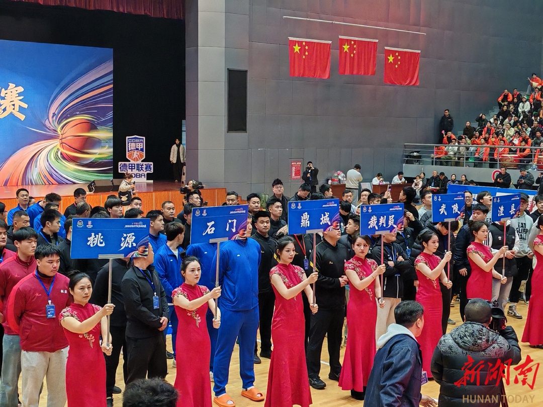3月6日,2026常德市甲级篮球联赛(简称“德甲”)开幕式在武陵区全民健身中心举行。武陵、鼎城、汉寿、石门等9支代表队齐聚一堂,共同见证这一汇聚全市篮球力量、彰显文旅体融合魅力的体育盛事启幕。