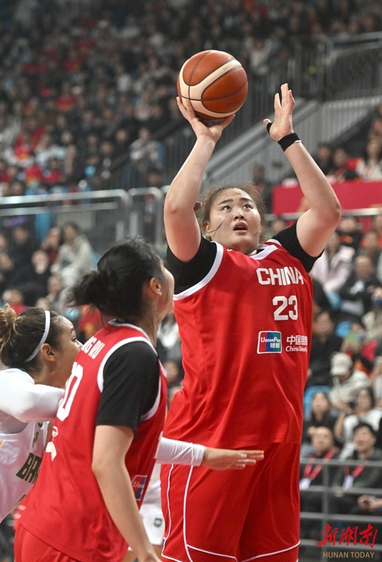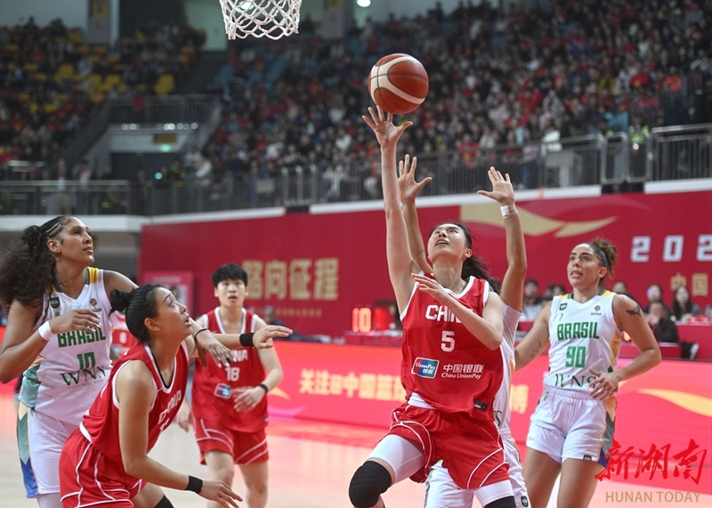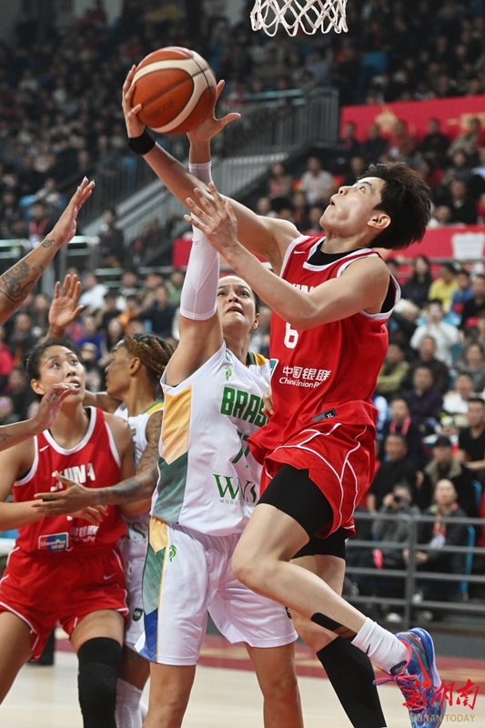 3月6日晚,中国队球员王思雨(前中)在比赛中上篮。当天,2026年中国女篮热身赛长沙站中国VS巴西第二场比赛在长沙民政职业技术学院举行,最终中国队以72比66战胜巴西队。湖南日报全媒体记者 郭立亮 摄