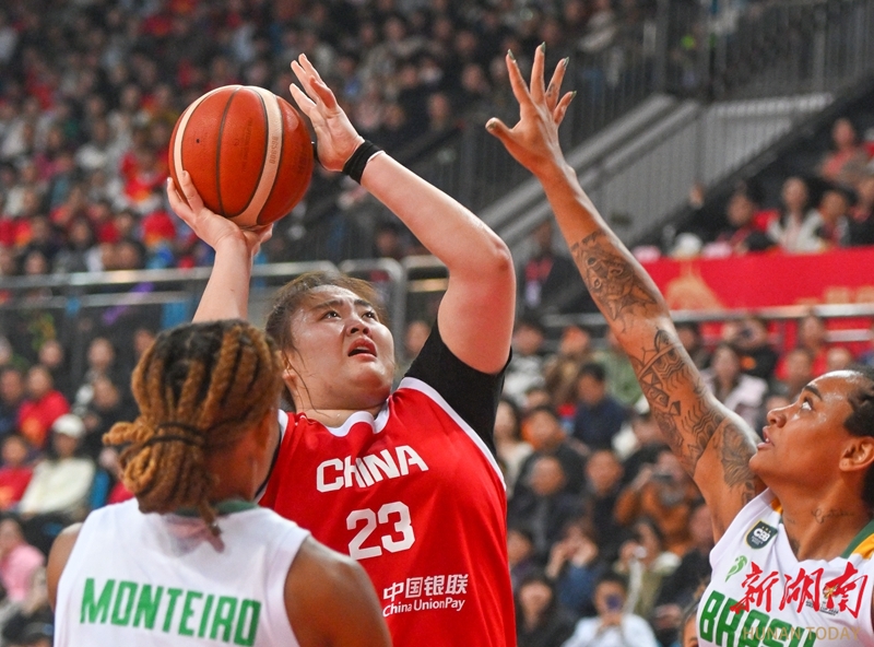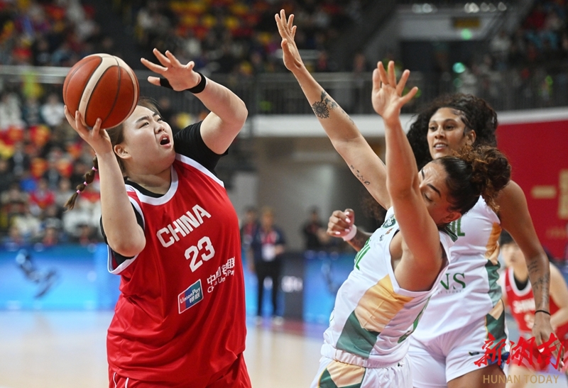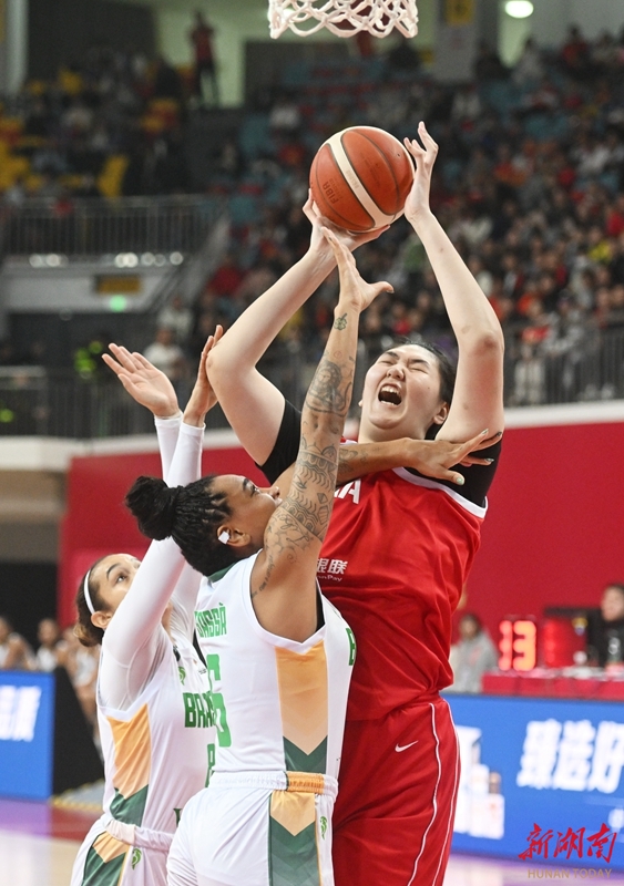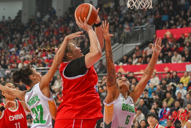 3月6日晚,中国队球员刘禹彤(中)在比赛中奋力突破上篮。当天,2026年中国女篮热身赛长沙站中国VS巴西第二场比赛在长沙民政职业技术学院举行,最终中国队以72比66战胜巴西队。湖南日报全媒体记者 郭立亮 摄