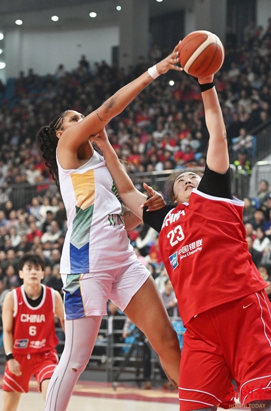 3月6日晚,中国队球员刘禹彤(右)在比赛中拼抢篮板球。当天,2026年中国女篮热身赛长沙站中国VS巴西第二场比赛在长沙民政职业技术学院举行,最终中国队以72比66战胜巴西队。湖南日报全媒体记者 郭立亮 摄