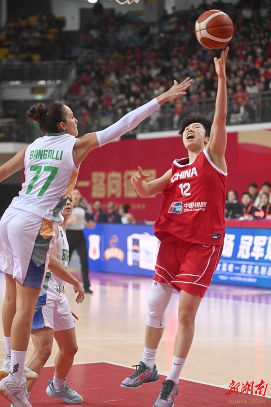 3月6日晚,中国队球员杨舒予(左)在比赛中进攻上篮。当天,2026年中国女篮热身赛长沙站中国VS巴西第二场比赛在长沙民政职业技术学院举行,最终中国队以72比66战胜巴西队。湖南日报全媒体记者 郭立亮 摄