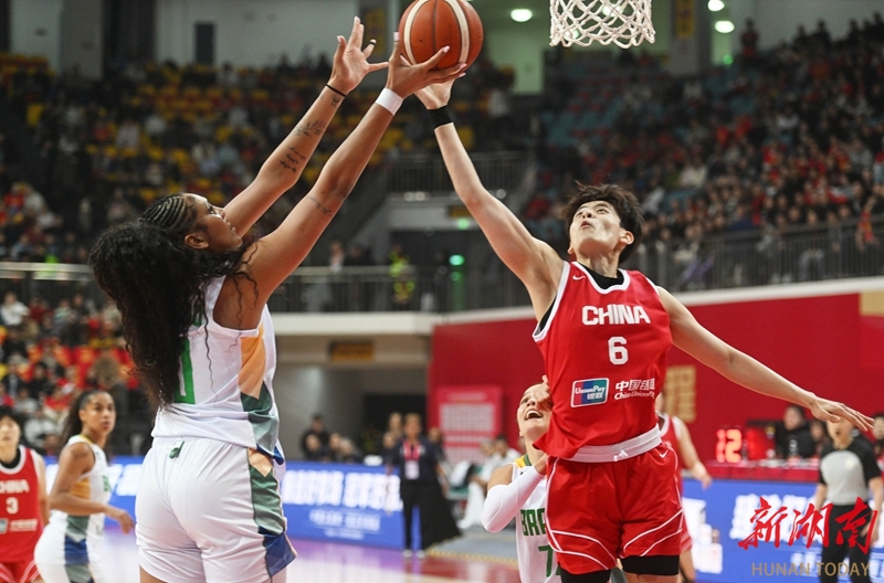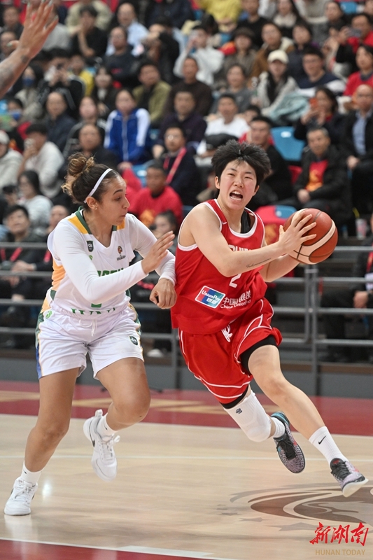 3月6日晚,中国队球员刘禹彤(左)在比赛中进攻。当天,2026年中国女篮热身赛长沙站中国VS巴西第二场比赛在长沙民政职业技术学院举行,最终中国队以72比66战胜巴西队。湖南日报全媒体记者 郭立亮 摄
