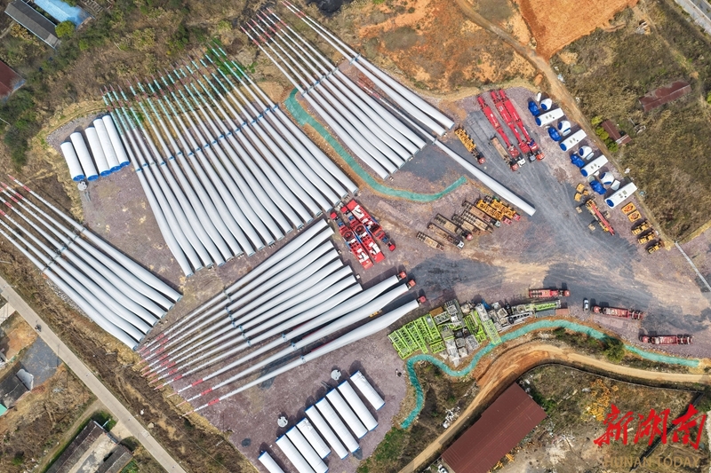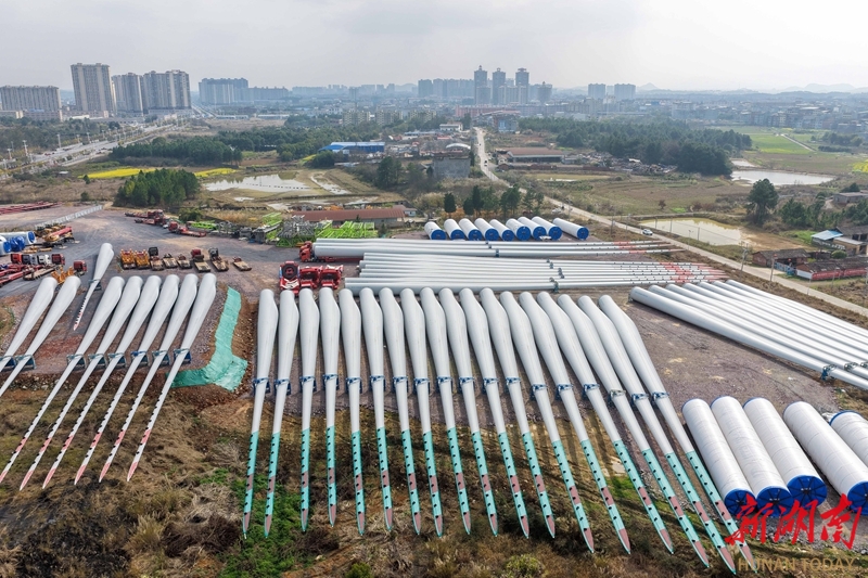 3月6日,道县富塘街道五里牌社区转运场,风电设备整齐排列。近年来,该县积极推动新能源产业发展,通过风电、光伏等清洁能源项目建设,既优化了能源结构,又拓宽了群众增收渠道,为乡村振兴注入绿色动能。蒋克青 摄(湖南图片库)