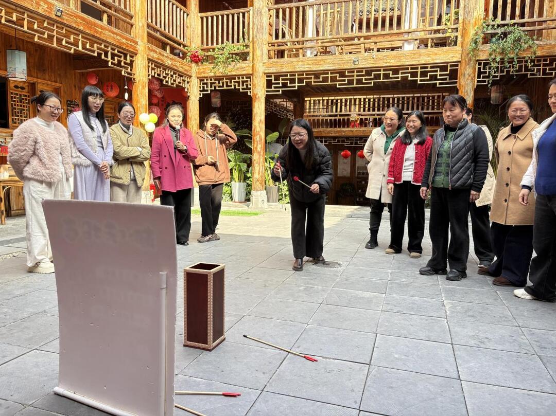 趣味投壶环节最受大家欢迎。比赛分组进行,每人投5箭,单手、双手投掷均可,箭支完全入壶且不弹出即为有效得分,最终按团体累计总分决出名次,同分则加赛3箭定胜负。现场,女职工们凝神瞄准、轻掷出手,有的稳准发力、箭箭入壶,有的不断调整姿势、越战越勇,围观同事的喝彩声、欢呼声此起彼伏,既紧张又热闹。