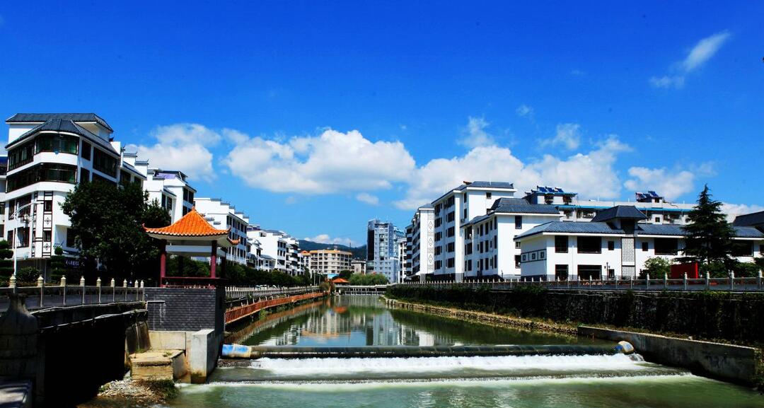 蓝天白云下的世界长寿乡桂东县城一角。(邓焱萍 摄)