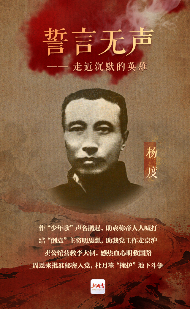 杨度(1875-1931),湖南湘潭县人,著名书法家。1927年李大钊被军阀张作霖逮捕后,他倾其所有进行营救;对蔡和森在北方策划的暴动也予以资助。经陈赓引见,1929年秋,由潘汉年、周恩来介绍秘密加入中国共产党。周旋于前清遗老、军阀、官僚和上层反动人物中间,获取情报,为保卫上海党中央的安全、营救被捕同志、惩治叛徒作出重要贡献。1975年,周恩来在逝世前委托上海《辞海》编辑部在“杨度”辞目中加注:“他晚年参加了党,是我领导的,直到他死。”