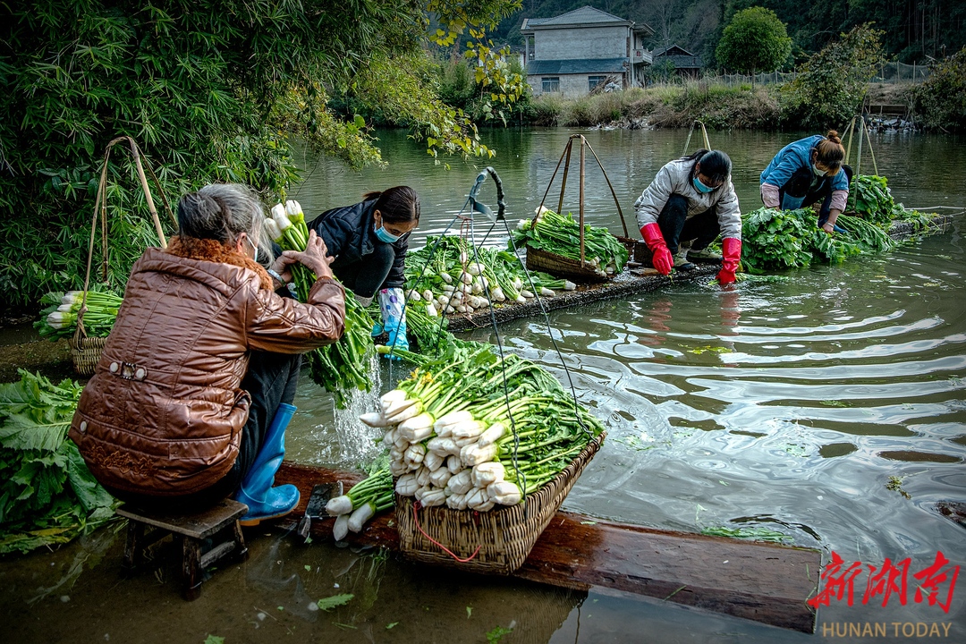 清清小溪水,农家妇女洗菜忙。