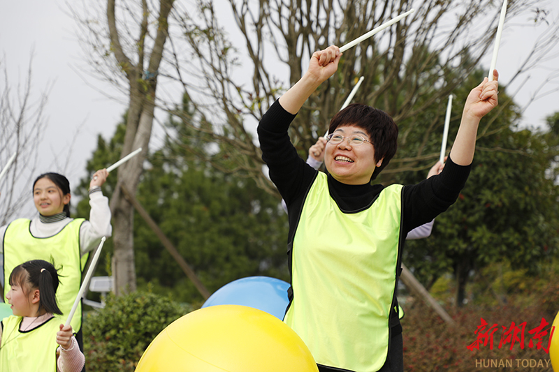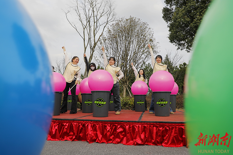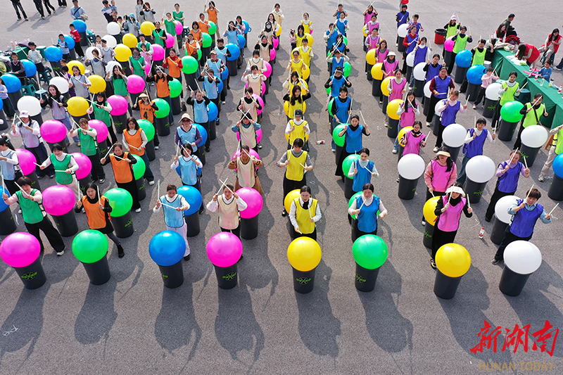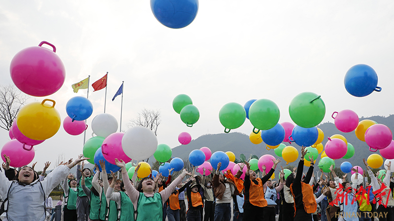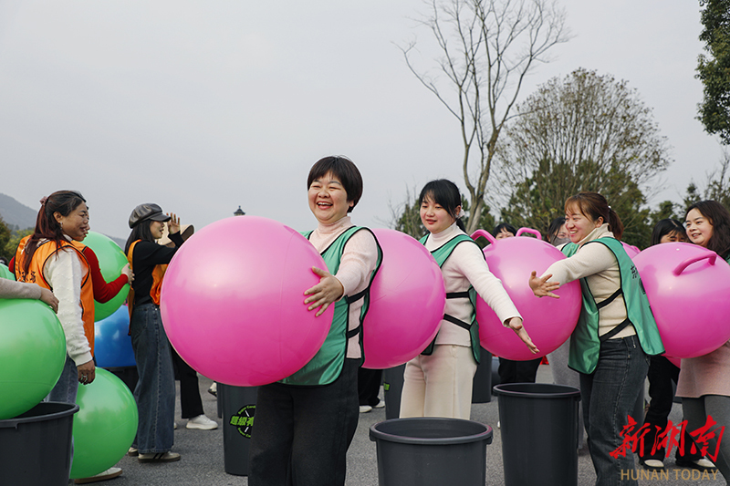 3月7日,新田县以“巾帼永冲锋·奋进新时代”为主题的迎“三八”趣味运动在该县东升农场举行,女同胞通过超级有氧鼓、龙有氧球、音乐飞球等趣味运动,喜庆“三八”国际妇女节。(湖南日报·新湖南客户端通讯员 钟伟锋 摄)