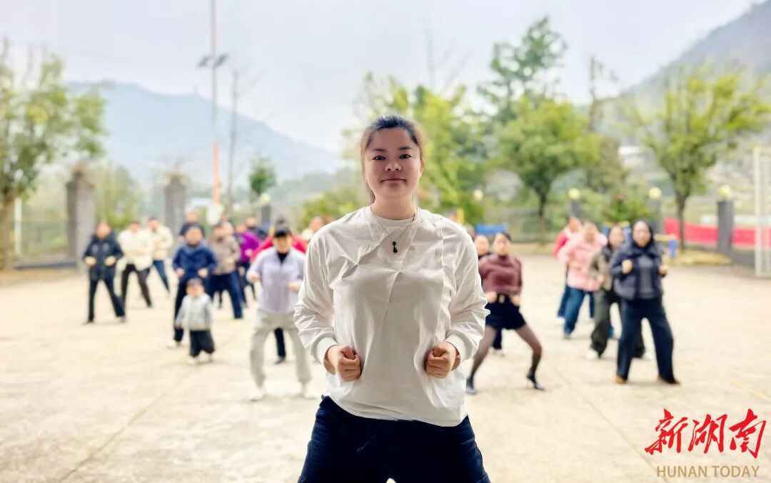 在驻村干部的带领下,妇女代表们来到开阔的户外广场,以青山为背景、以蓝天为幕布,伴随着古朴舒缓的音乐,凝神静气,一招一式认真练习中医传统养生功法“八段锦”。