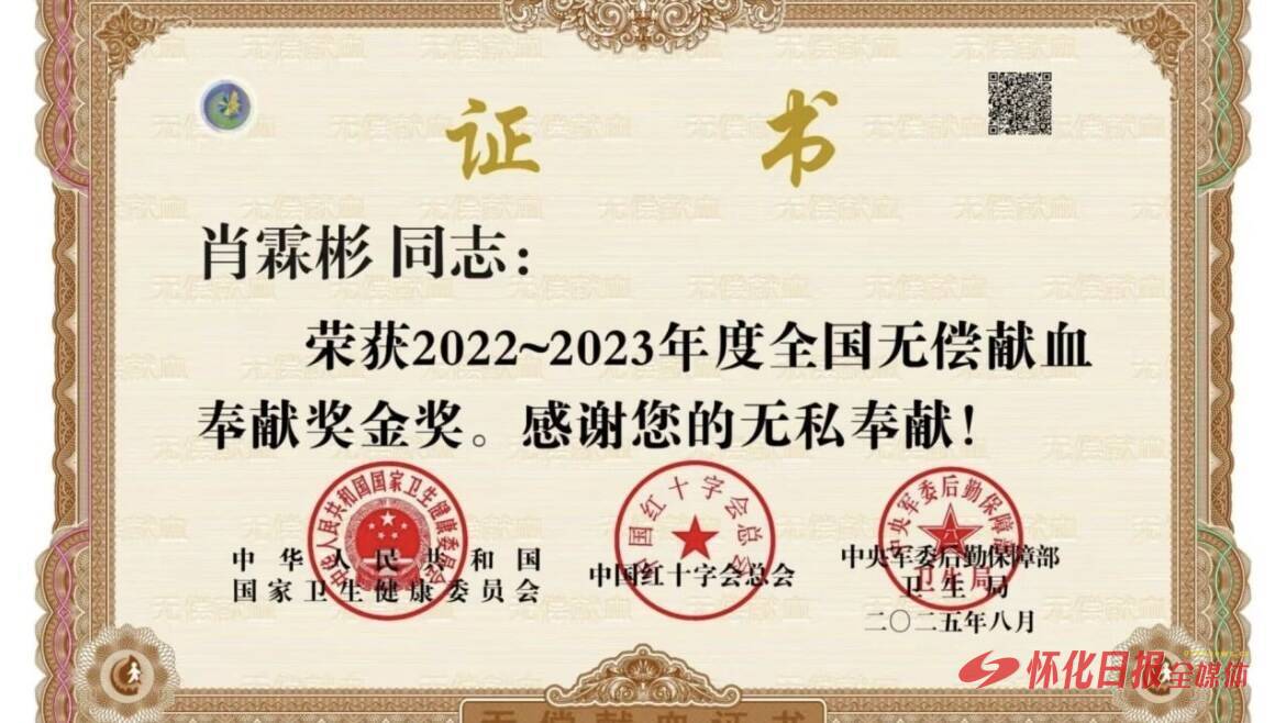 (肖霖彬获全国无偿献血奉献奖金奖)