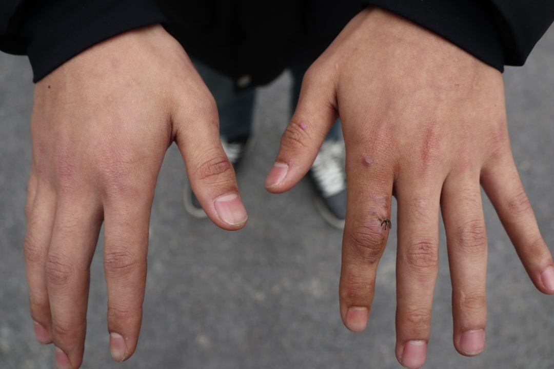 (张惠鸿手上愈合的创伤依稀可见。)